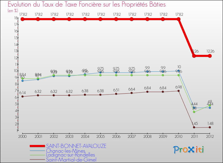 Pendant la même période, les communes françaises similaires à Saint-Bonnet-Avalouze, ont vu leur taux de taxe foncière sur le bâti augmenter de 6.47 % en moyenne entre 2000 et 2012.