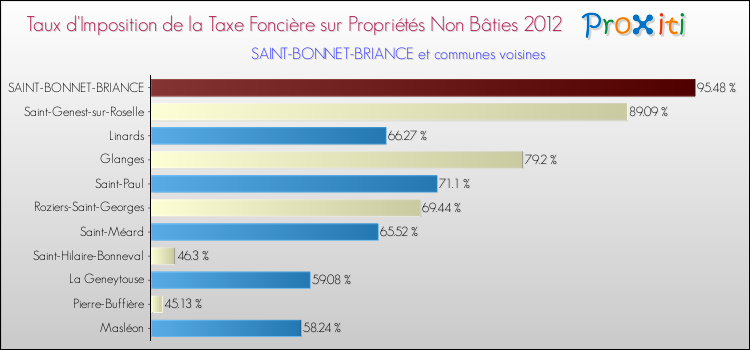 En 2012, le taux de la taxe foncière sur le non bâti vôté par le conseil municipal de Saint-Bonnet-Briance était de : 95.48 %.