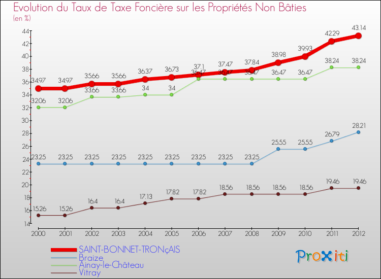 Pendant la même période, les communes françaises similaires à Saint-Bonnet-Tronçais, ont vu leur taux de taxe foncière sur le non bâti augmenter de 26.66 % en moyenne entre 2000 et 2012.
