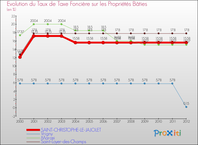 A Saint-Christophe-le-Jajolet, le taux de taxe foncière sur le bâti a donc augmenté de 28.76 % entre 2000 et 2012.
