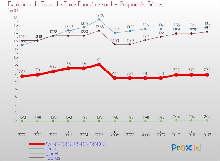 A Saint-Cirgues-de-Prades, le taux de taxe foncière sur le bâti a donc augmenté de 1.97 % entre 2000 et 2012.