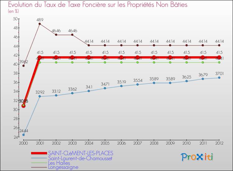 A Saint-Clément-les-Places, le taux de taxe foncière sur le non bâti a donc augmenté de 34.83 % entre 2000 et 2012.