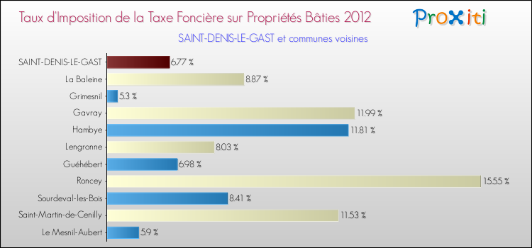 En 2012, le taux de la taxe foncière sur le bâti vôté par le conseil municipal de Saint-Denis-le-Gast était de : 6.77 %.