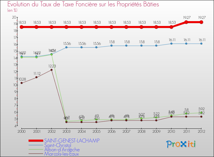 En 2012, le taux de la taxe foncière sur le bâti vôté par le conseil municipal de Saint-Genest-Lachamp était de : 19.27 %.