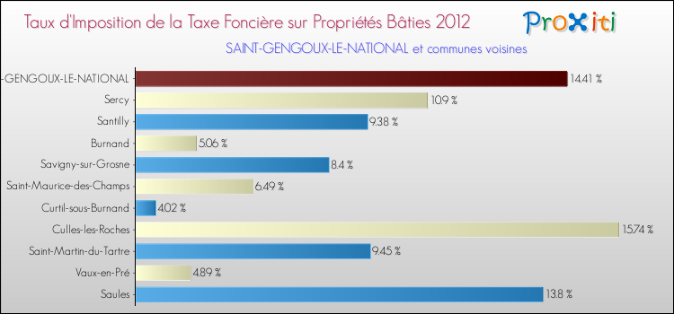 Pendant la même période, les communes françaises similaires à Saint-Gengoux-le-National, ont vu leur taux de taxe foncière sur le bâti augmenter de 22.76 % en moyenne entre 2000 et 2012.