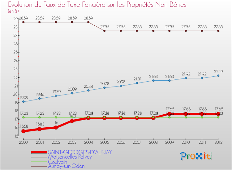 A Saint-Georges-d'Aunay, le taux de taxe foncière sur le non bâti a donc augmenté de 13.29 % entre 2000 et 2012.