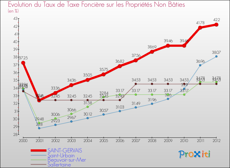 Pendant la même période, les communes françaises similaires à Saint-Gervais, ont vu leur taux de taxe foncière sur le non bâti augmenter de 9.03 % en moyenne entre 2000 et 2012.