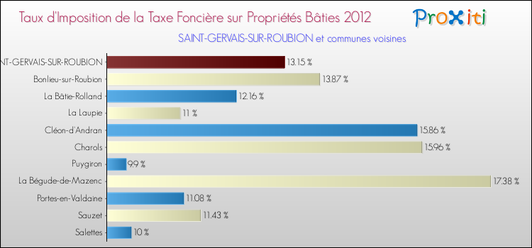 En 2012, le taux de la taxe foncière sur le bâti vôté par le conseil municipal de Saint-Gervais-sur-Roubion était de : 13.15 %.