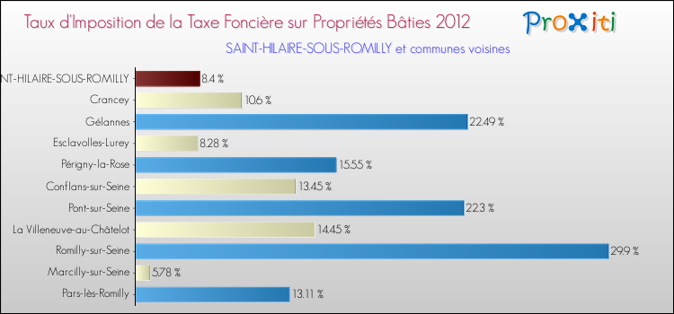 En 2012, le taux de la taxe foncière sur le bâti vôté par le conseil municipal de Saint-Hilaire-sous-Romilly était de : 8.4 %.