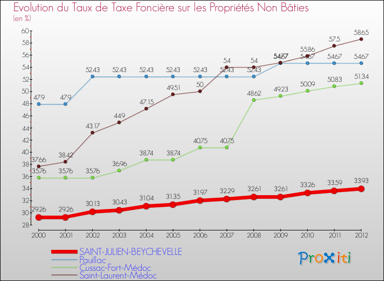 A Saint-Julien-Beychevelle, le taux de taxe foncière sur le non bâti a donc augmenté de 15.96 % entre 2000 et 2012.