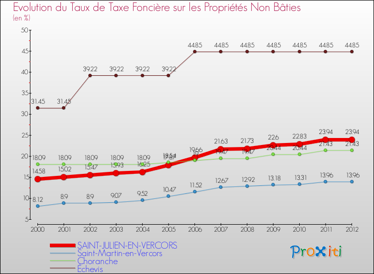 A Saint-Julien-en-Vercors, le taux de taxe foncière sur le non bâti a donc augmenté de 64.2 % entre 2000 et 2012.