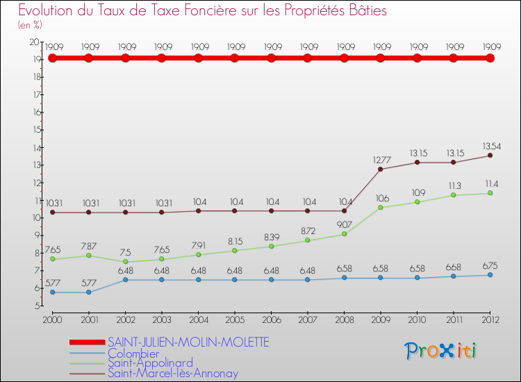 A Saint-Julien-Molin-Molette, le taux de taxe foncière sur le bâti a donc augmenté de 0 % entre 2000 et 2012.