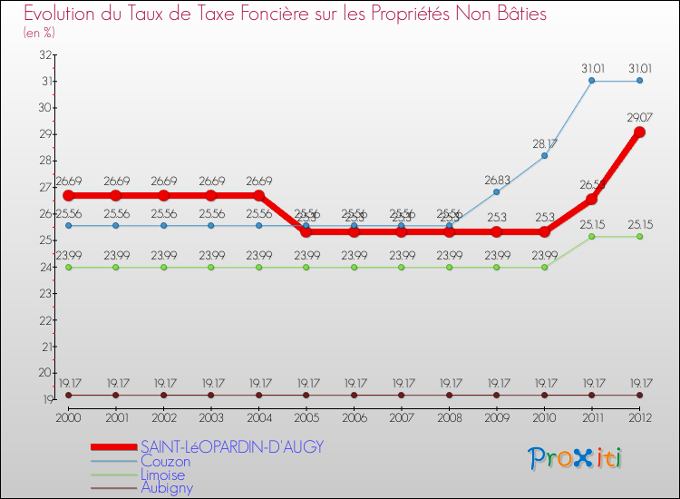 A Saint-Léopardin-d'Augy, le taux de taxe foncière sur le non bâti a donc augmenté de 8.92 % entre 2000 et 2012.