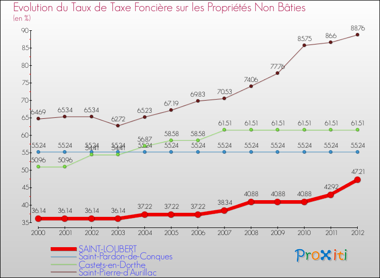 A Saint-Loubert, le taux de taxe foncière sur le non bâti a donc augmenté de 30.63 % entre 2000 et 2012.