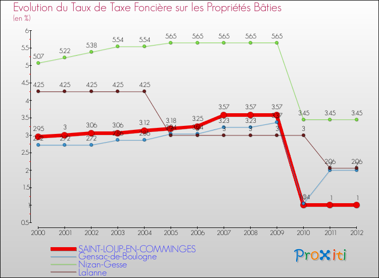 Pendant la même période, les communes françaises similaires à Saint-Loup-en-Comminges, ont vu leur taux de taxe foncière sur le bâti baisser de 8.77 % en moyenne entre 2000 et 2012.