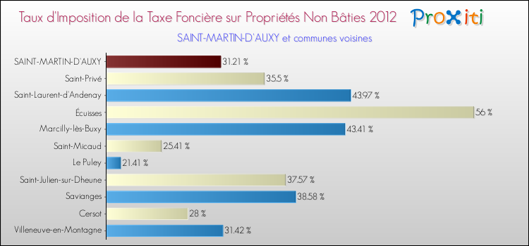 En 2012, le taux de la taxe foncière sur le non bâti vôté par le conseil municipal de Saint-Martin-d'Auxy était de : 31.21 %.
