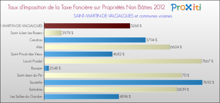 En 2012, le taux de la taxe foncière sur le non bâti vôté par le conseil municipal de Saint-Martin-de-Valgalgues était de : 52.68 %.
