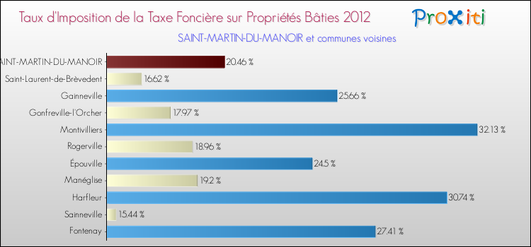 En 2012, le taux de la taxe foncière sur le bâti vôté par le conseil municipal de Saint-Martin-du-Manoir était de : 20.46 %.