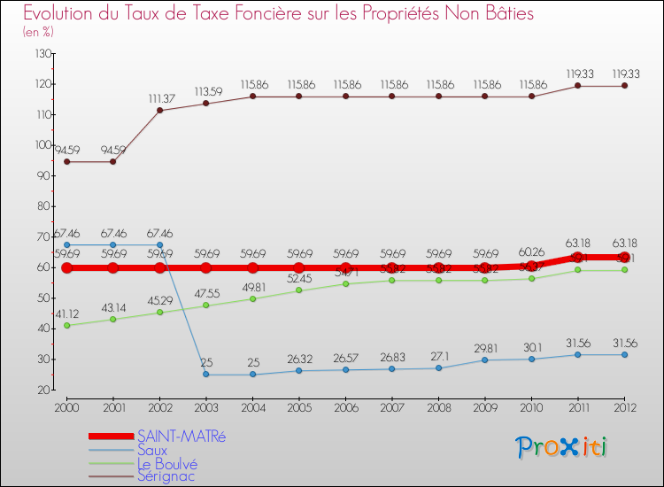 A Saint-Matré, le taux de taxe foncière sur le non bâti a donc augmenté de 5.85 % entre 2000 et 2012.