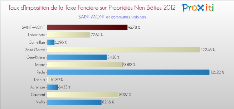 En 2012, le taux de la taxe foncière sur le non bâti vôté par le conseil municipal de Saint-Mont était de : 92.78 %.