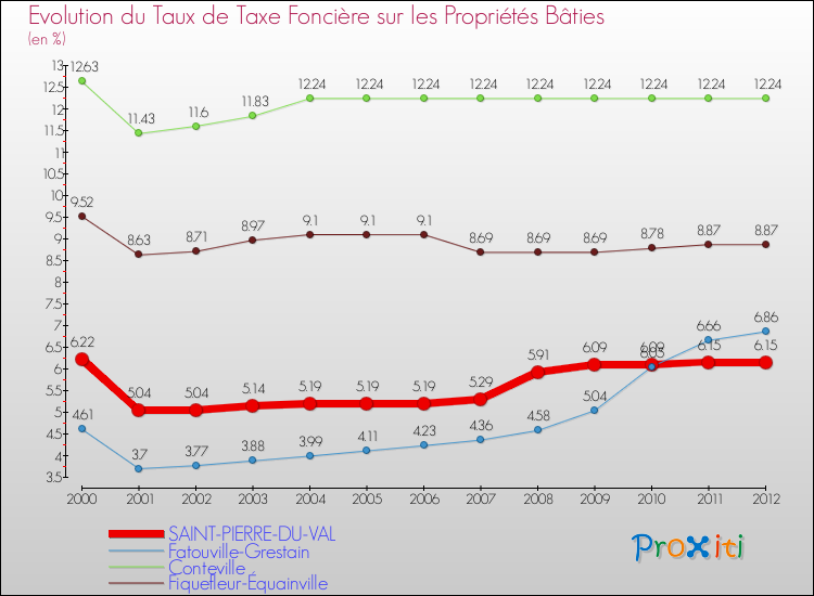 Pendant la même période, les communes françaises similaires à Saint-Pierre-du-Val, ont vu leur taux de taxe foncière sur le bâti augmenter de 6.01 % en moyenne entre 2000 et 2012.