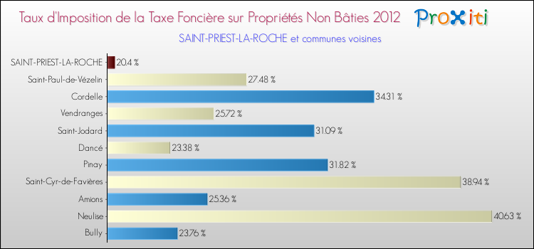Pendant la même période, les communes françaises similaires à Saint-Priest-la-Roche, ont vu leur taux de taxe foncière sur le non bâti augmenter de 29.51 % en moyenne entre 2000 et 2012.