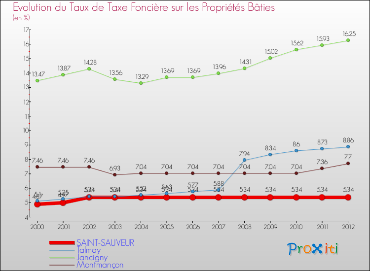 A Saint-Sauveur, le taux de taxe foncière sur le bâti a donc augmenté de 9.65 % entre 2000 et 2012.