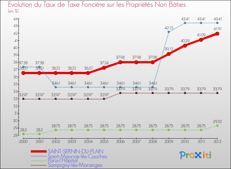 Pendant la même période, les communes françaises similaires à Saint-Sernin-du-Plain, ont vu leur taux de taxe foncière sur le non bâti augmenter de 26.66 % en moyenne entre 2000 et 2012.
