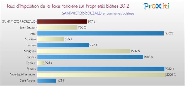 En 2012, le taux de la taxe foncière sur le bâti vôté par le conseil municipal de Saint-Victor-Rouzaud était de : 8.97 %.