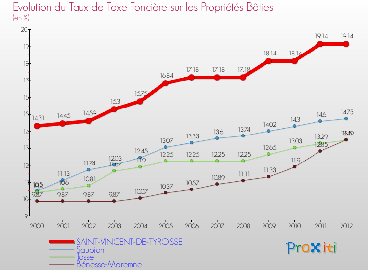 En 2012, le taux de la taxe foncière sur le bâti vôté par le conseil municipal de Saint-Vincent-de-Tyrosse était de : 19.14 %.