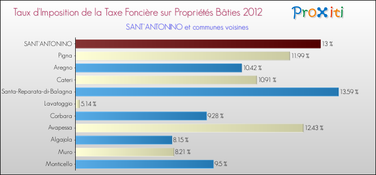 En 2012, le taux de la taxe foncière sur le bâti vôté par le conseil municipal de Sant'Antonino était de : 13 %.