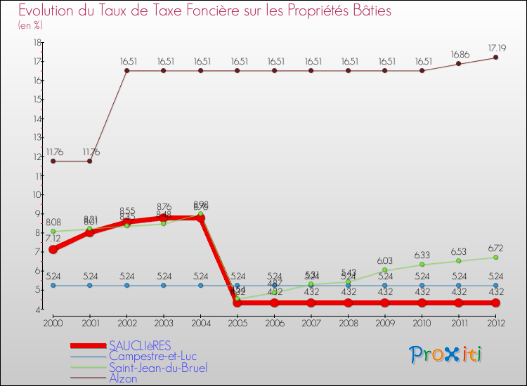 Pendant la même période, les communes françaises similaires à Sauclières, ont vu leur taux de taxe foncière sur le bâti augmenter de 23.42 % en moyenne entre 2000 et 2012.