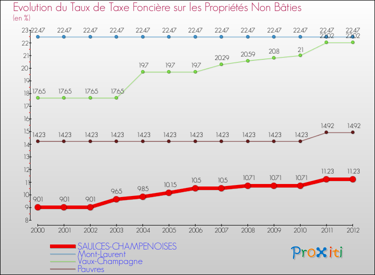 En 2012, le taux de la taxe foncière sur le non bâti vôté par le conseil municipal de Saulces-Champenoises était de : 11.23 %.