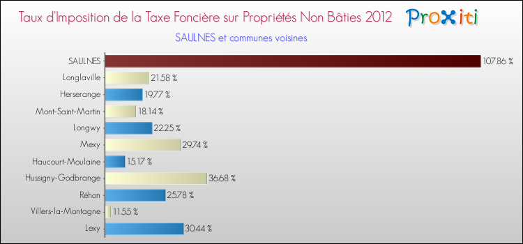 En 2012, le taux de la taxe foncière sur le non bâti vôté par le conseil municipal de Saulnes était de : 107.86 %.