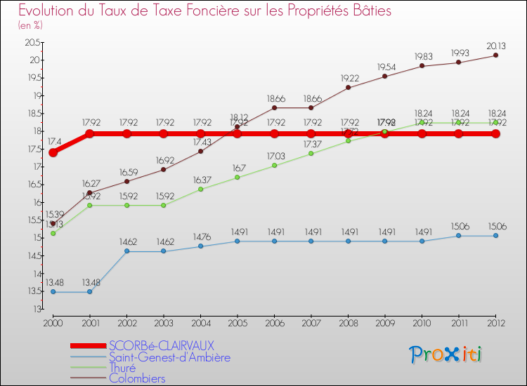 A Scorbé-Clairvaux, le taux de taxe foncière sur le bâti a donc augmenté de 2.99 % entre 2000 et 2012.