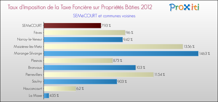 Vous trouverez ci-dessous des graphiques qui vous permettent de situer le taux de la taxe foncière sur le bâti de Semécourt par rapport aux communes voisines.