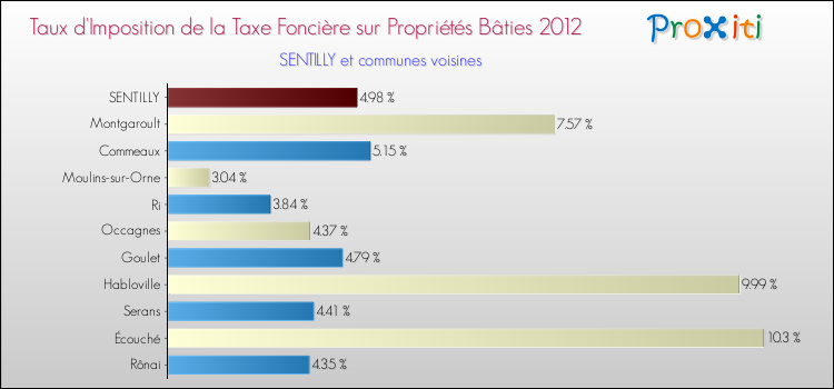 En 2012, le taux de la taxe foncière sur le bâti vôté par le conseil municipal de Sentilly était de : 4.98 %.