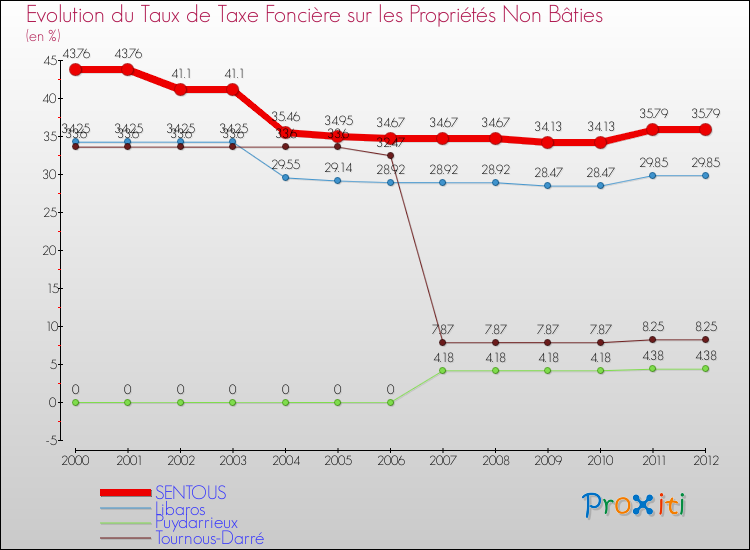 A Sentous, le taux de taxe foncière sur le non bâti a donc baissé de 18.21 % entre 2000 et 2012.