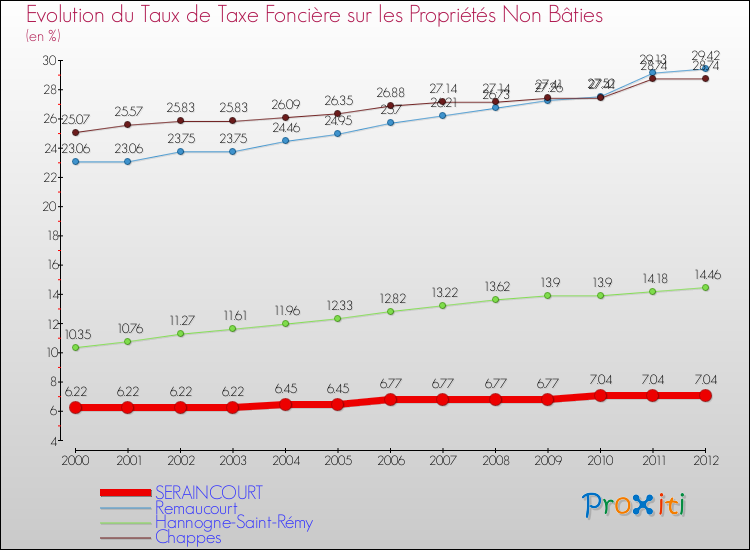 Pendant la même période, les communes françaises similaires à Seraincourt, ont vu leur taux de taxe foncière sur le non bâti augmenter de 57.09 % en moyenne entre 2000 et 2012.