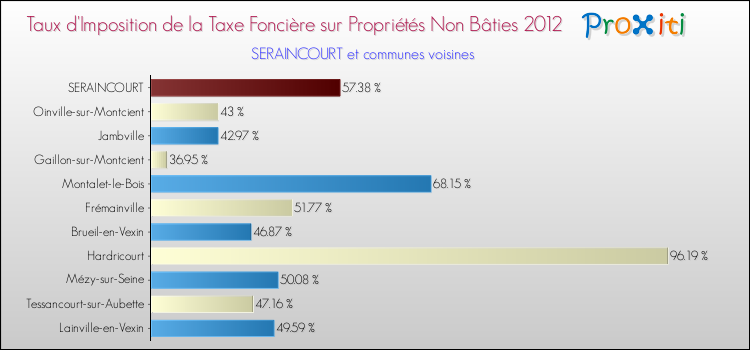 En 2012, le taux de la taxe foncière sur le non bâti vôté par le conseil municipal de Seraincourt était de : 57.38 %.