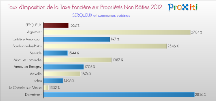 Vous trouverez ci-dessous des graphiques qui vous permettent de situer le taux de la taxe foncière sur le non bâti de Serqueux par rapport aux communes voisines.