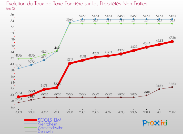 Pendant la même période, les communes françaises similaires à Sigolsheim, ont vu leur taux de taxe foncière sur le non bâti augmenter de 26.66 % en moyenne entre 2000 et 2012.