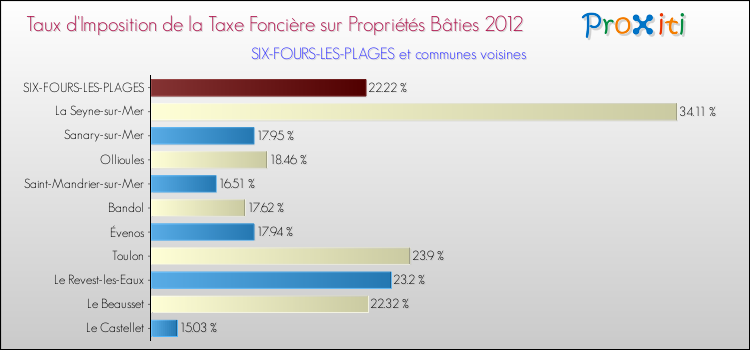 En 2012, le taux de la taxe foncière sur le bâti vôté par le conseil municipal de Six-Fours-les-Plages était de : 22.22 %.