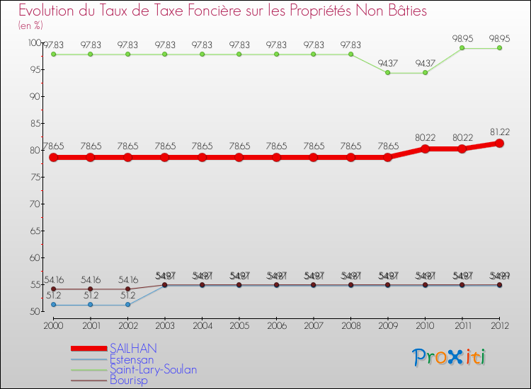 Pendant la même période, les communes françaises similaires à Sailhan, ont vu leur taux de taxe foncière sur le non bâti augmenter de 25.51 % en moyenne entre 2000 et 2012.