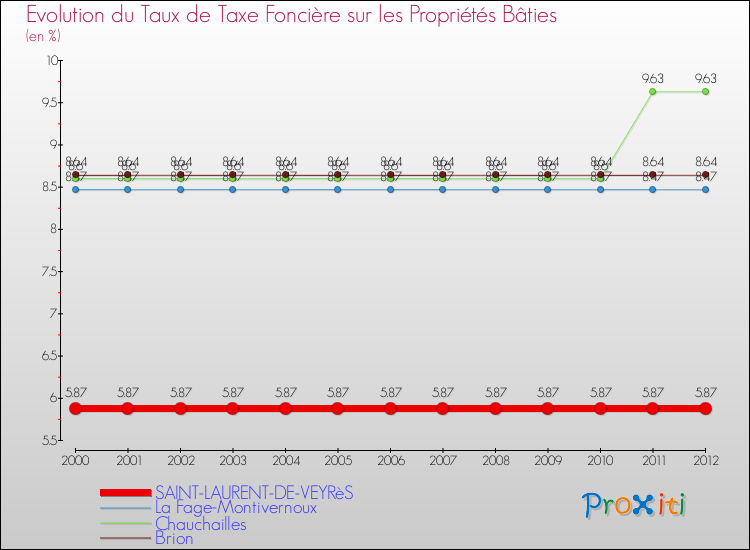 Pendant la même période, les communes françaises similaires à Saint-Laurent-de-Veyrès, ont vu leur taux de taxe foncière sur le bâti augmenter de 7.68 % en moyenne entre 2000 et 2012.