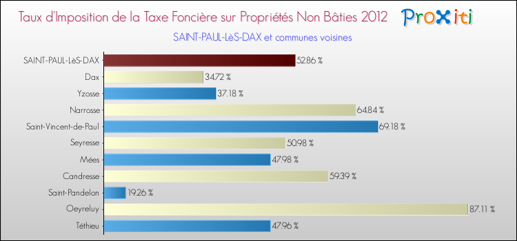En 2012, le taux de la taxe foncière sur le non bâti vôté par le conseil municipal de Saint-Paul-lès-Dax était de : 52.86 %.