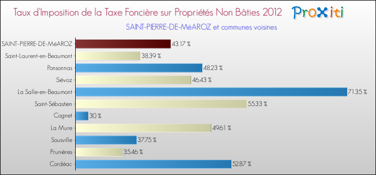 En 2012, le taux de la taxe foncière sur le non bâti vôté par le conseil municipal de Saint-Pierre-de-Méaroz était de : 43.17 %.