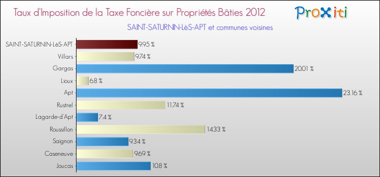 En 2012, le taux de la taxe foncière sur le bâti vôté par le conseil municipal de Saint-Saturnin-lès-Apt était de : 9.95 %.
