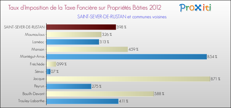 A noter : la valeur moyenne de ce taux de taxe foncière sur le bâti dans les communes françaises similaires à Saint-Sever-de-Rustan était de 10.09 %, en 2012.