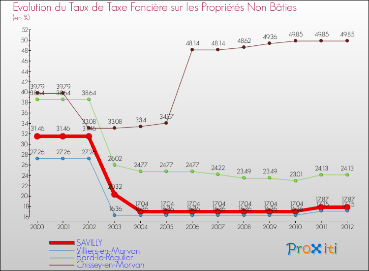 Pendant la même période, les communes françaises similaires à Savilly, ont vu leur taux de taxe foncière sur le non bâti baisser de 16.24 % en moyenne entre 2000 et 2012.